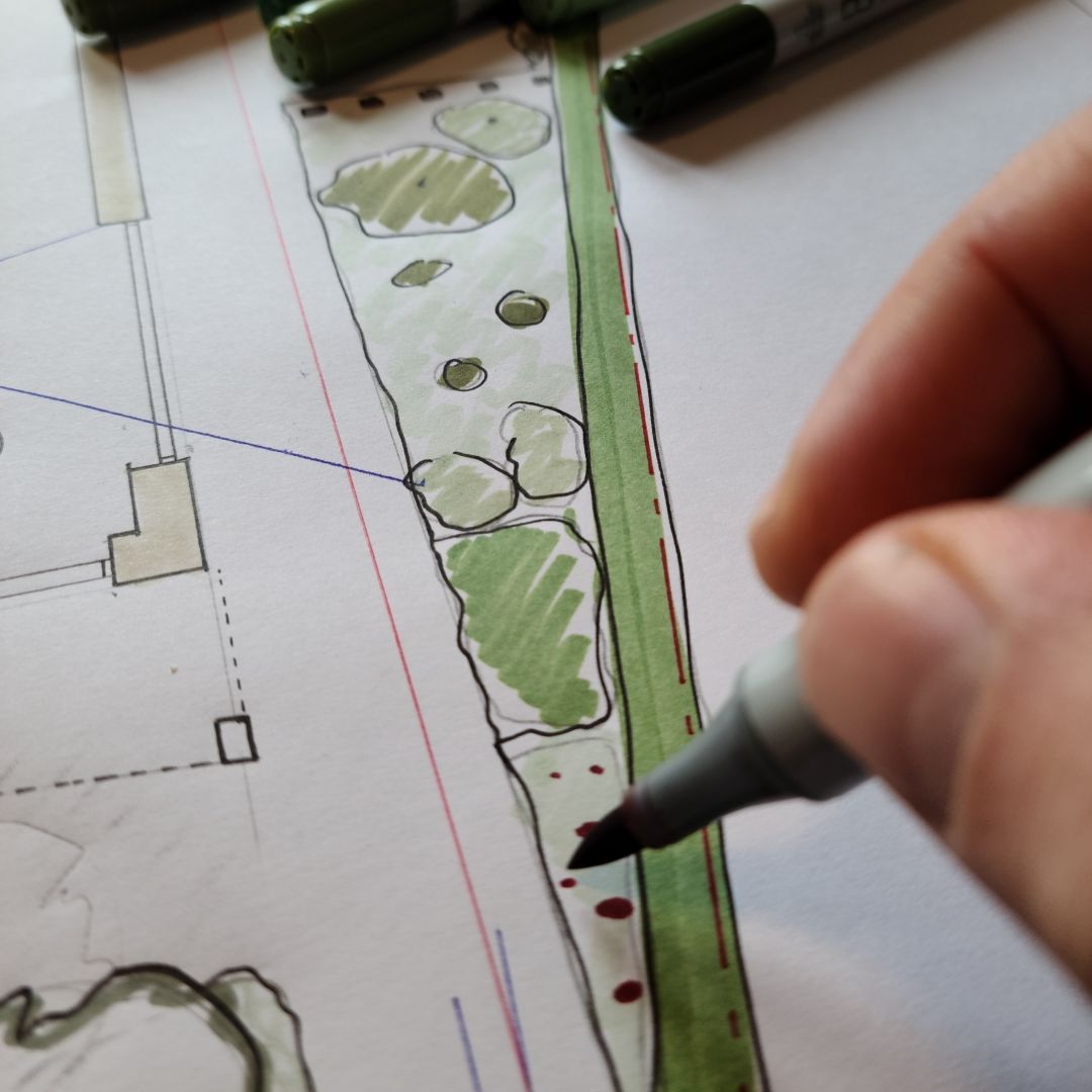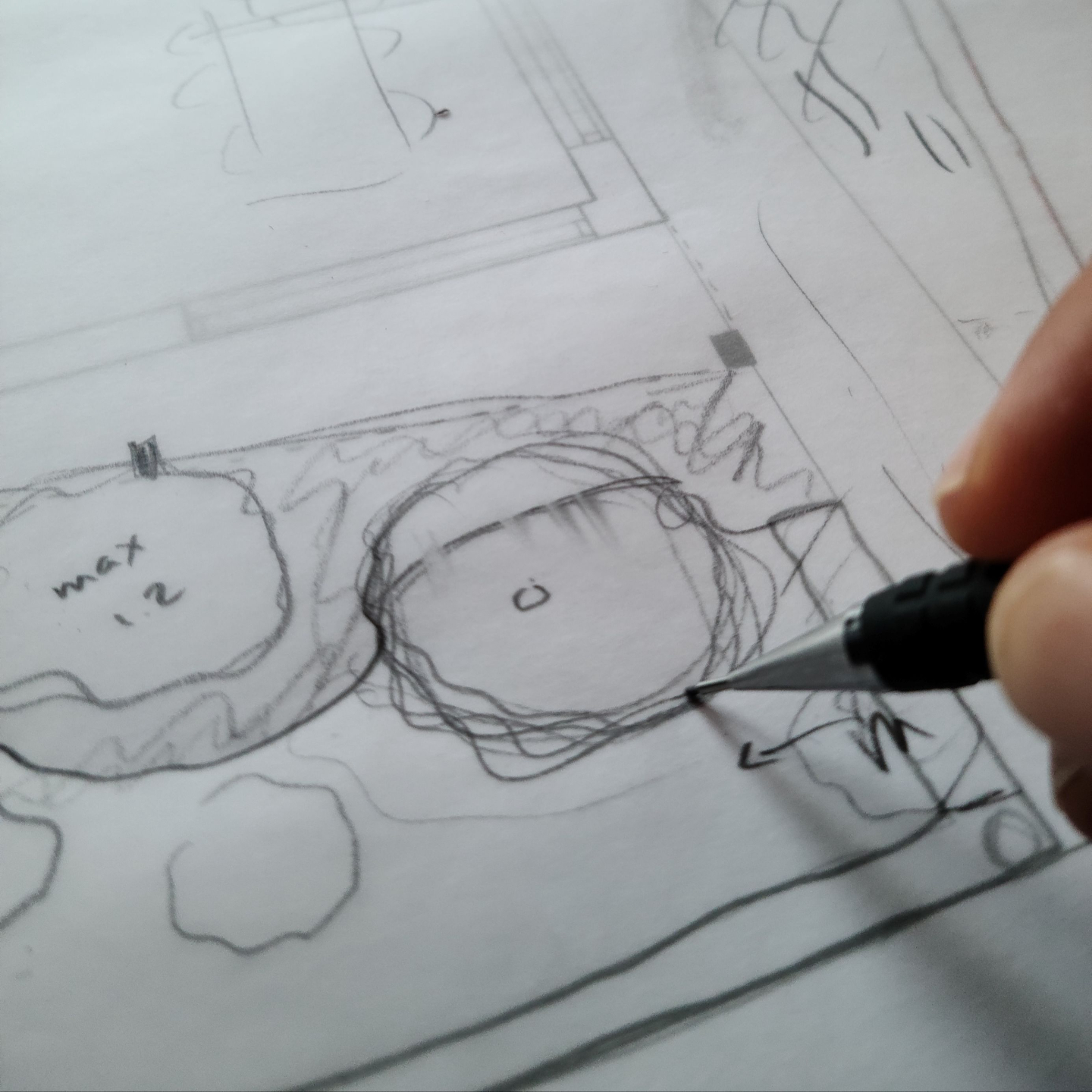 Werk de eerste indeling verder op schaal uit met vormen, zichtlijnen en beplantingskeuzes.